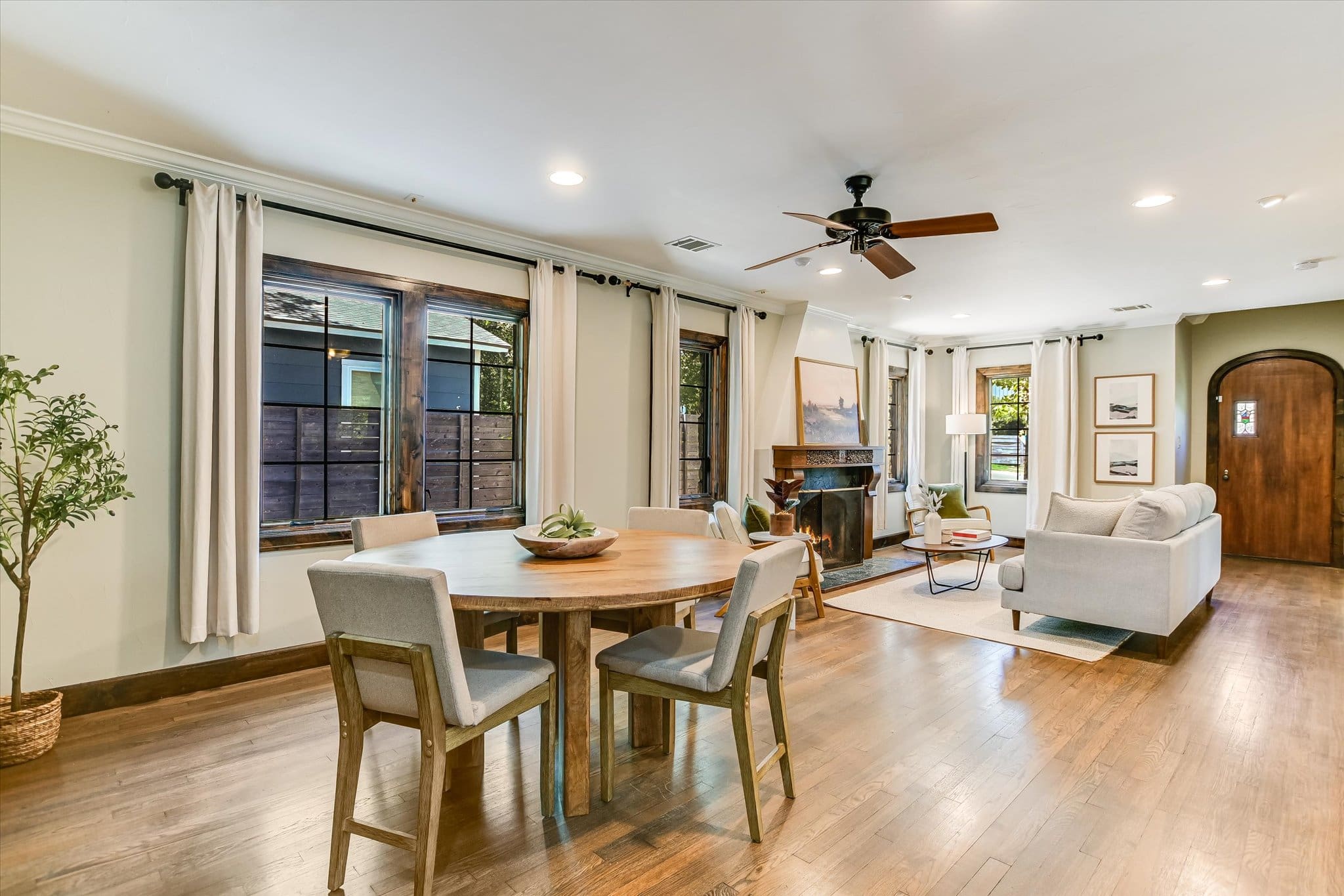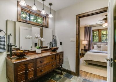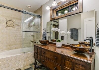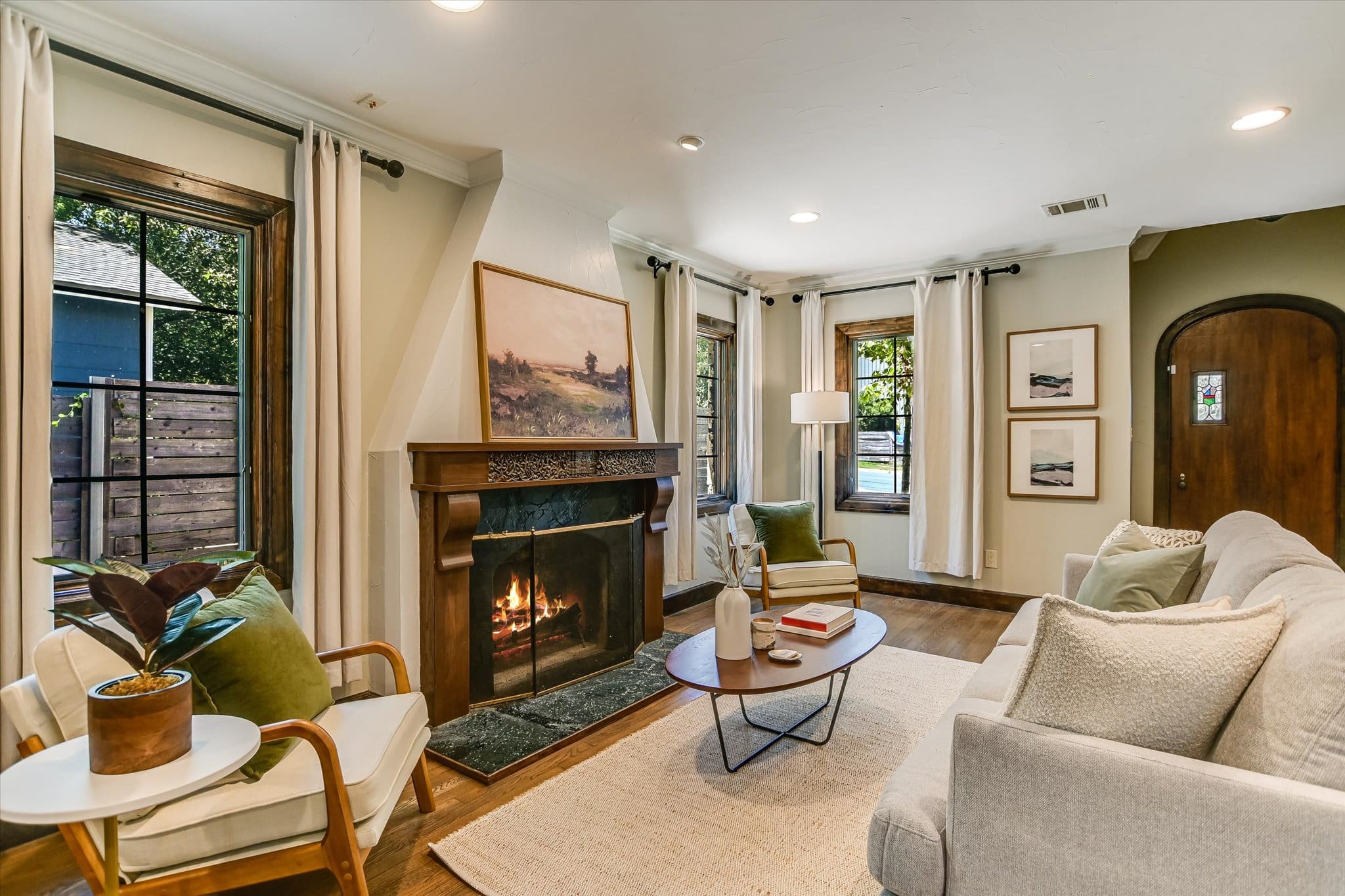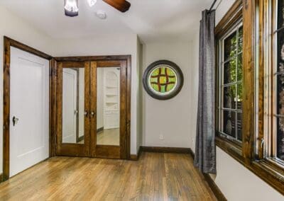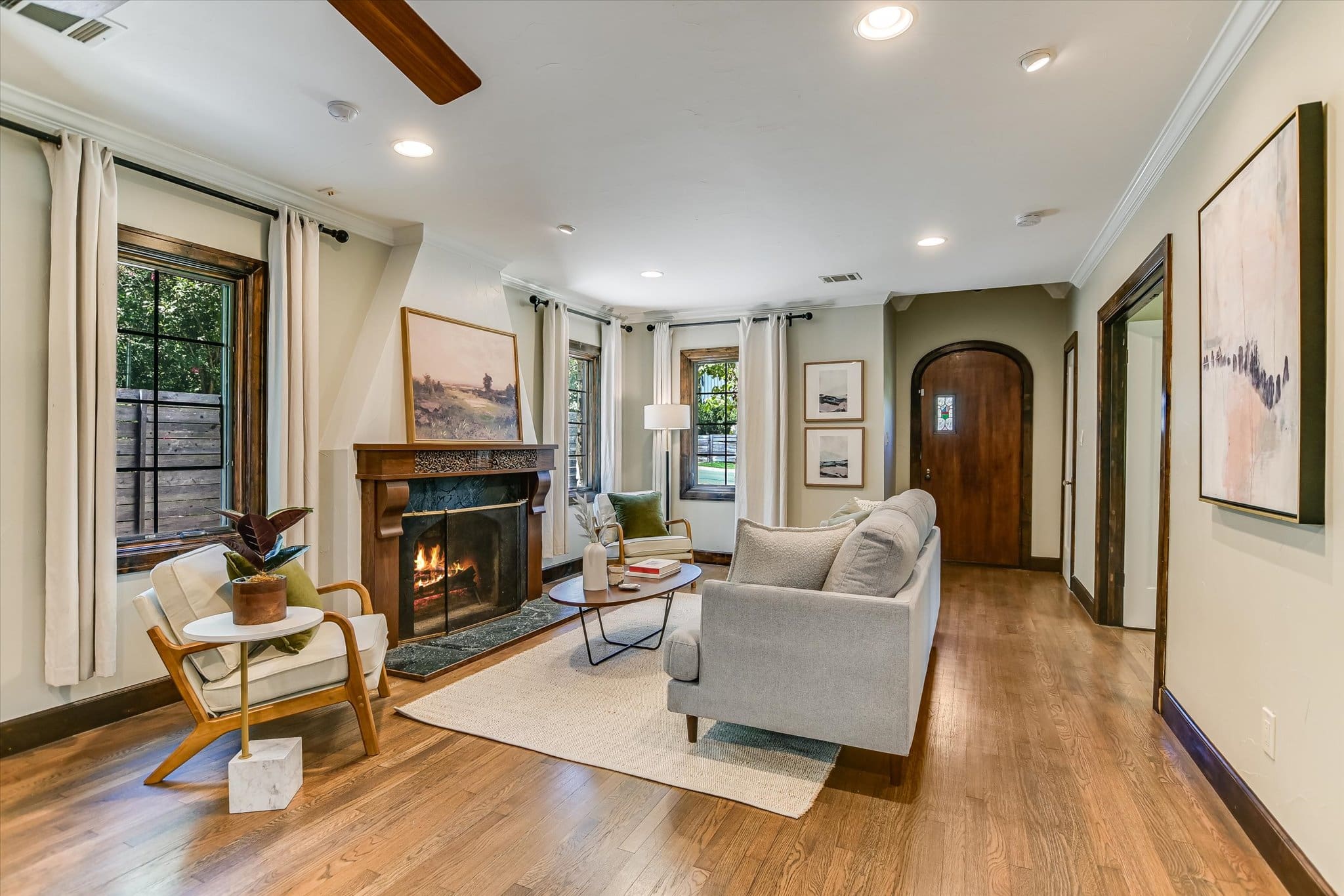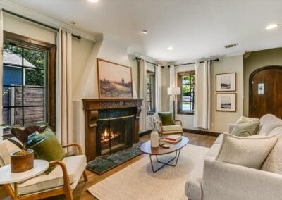 Inside, you’ll find a thoughtfully updated floorplan featuring a generous kitchen, a primary suite with full bath and walk-in closet, and classic details that have been lovingly preserved. Highlights include the timeless arched front door, original red oak floors, refinished 1930s interior doors and hardware, a bespoke fireplace, and restored built-ins. Antique drawer chests repurposed into vanities add one-of-a-kind charm to the bathrooms.