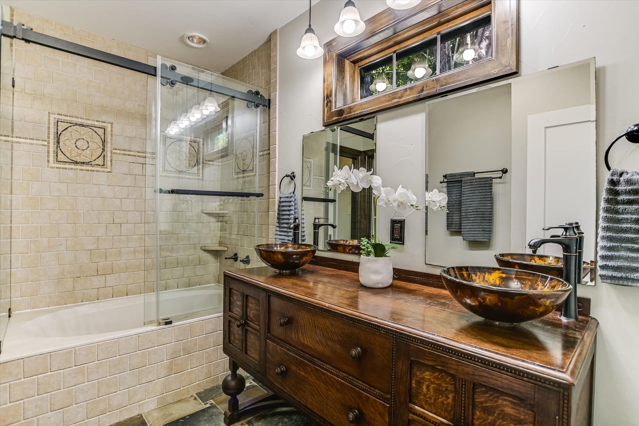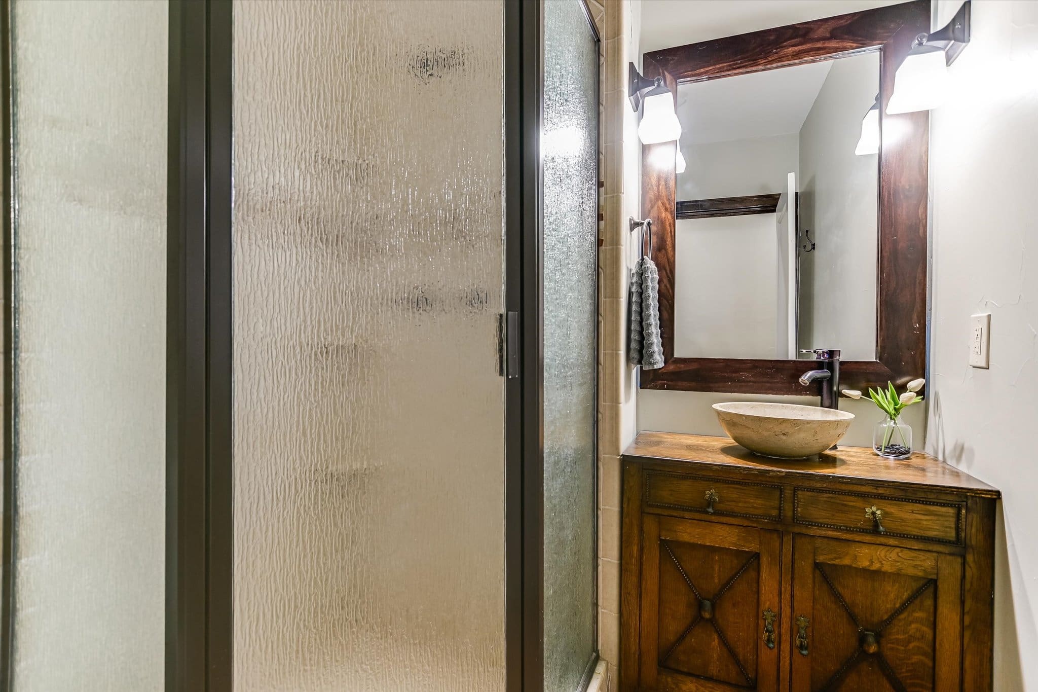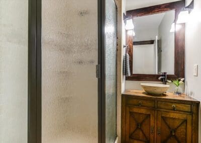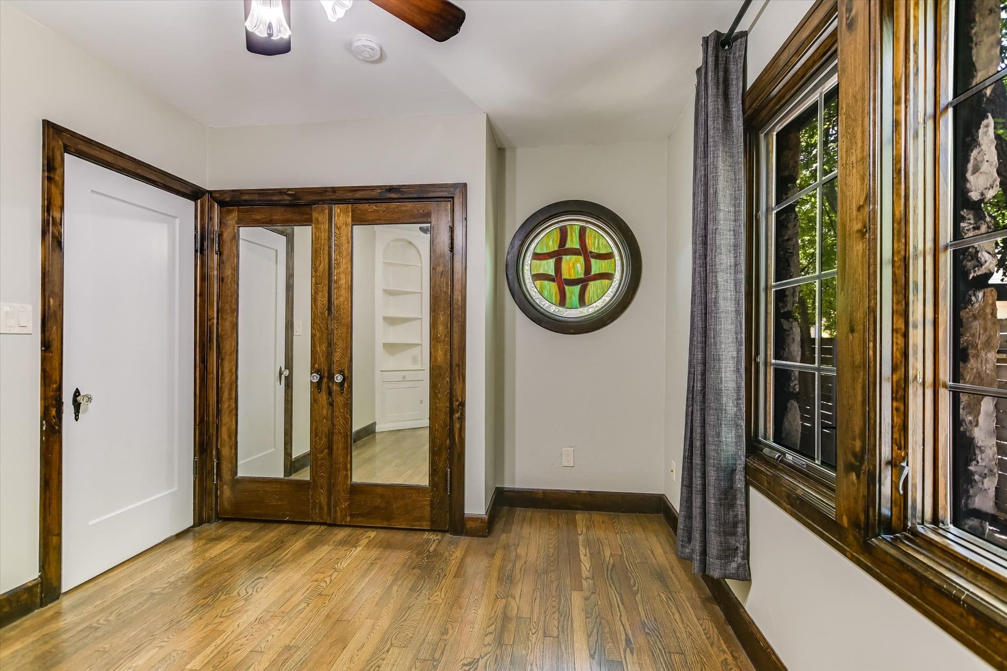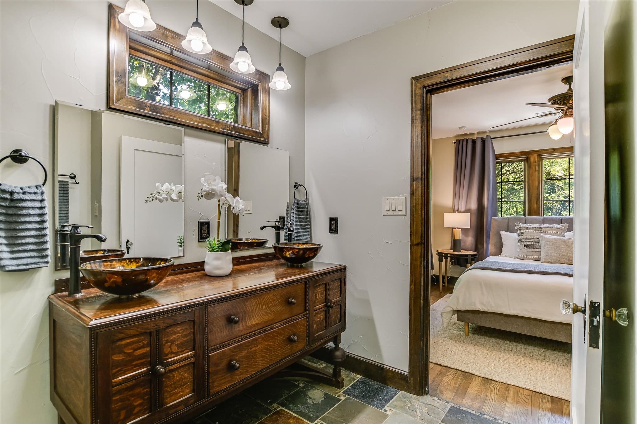 Inside, you’ll find a thoughtfully updated floorplan featuring a generous kitchen, a primary suite with full bath and walk-in closet, and classic details that have been lovingly preserved. Highlights include the timeless arched front door, original red oak floors, refinished 1930s interior doors and hardware, a bespoke fireplace, and restored built-ins. Antique drawer chests repurposed into vanities add one-of-a-kind charm to the bathrooms.